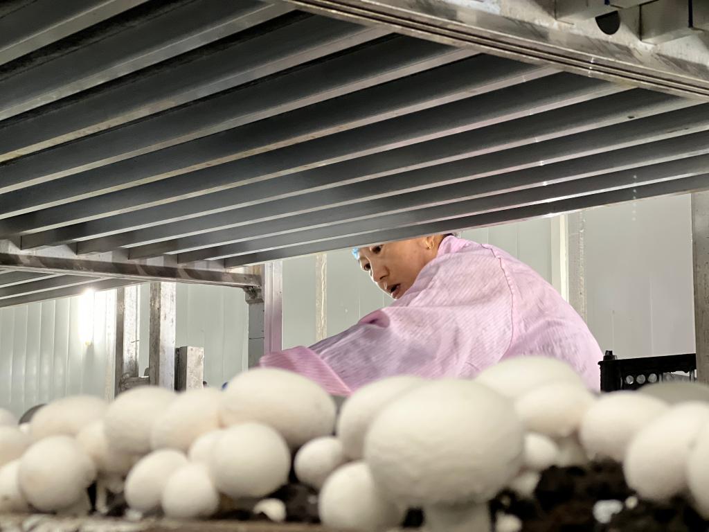 在穆棱市一家双孢菇生产基地,工作人员采摘双孢菇。新华社记者 刘赫垚 摄